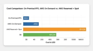 Key insight: On-demand cloud is more expensive than a well-managed VPS — but Reserved Instances + Savings Plans tip the math firmly in cloud’s favor, delivering 24–40% savings versus on-prem plus eliminating hardware refresh cycles, datacenter leases, and ops headcount.
