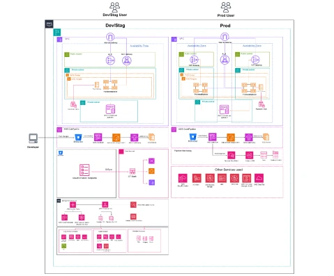 • Production: Production workloads run on ECS Fargate clusters across multiple Availability Zones for high availability. Application data resides in Amazon Aurora (PostgreSQL/MSSQL), while static media is stored in Amazon S3 and distributed globally through CloudFront for low-latency access.